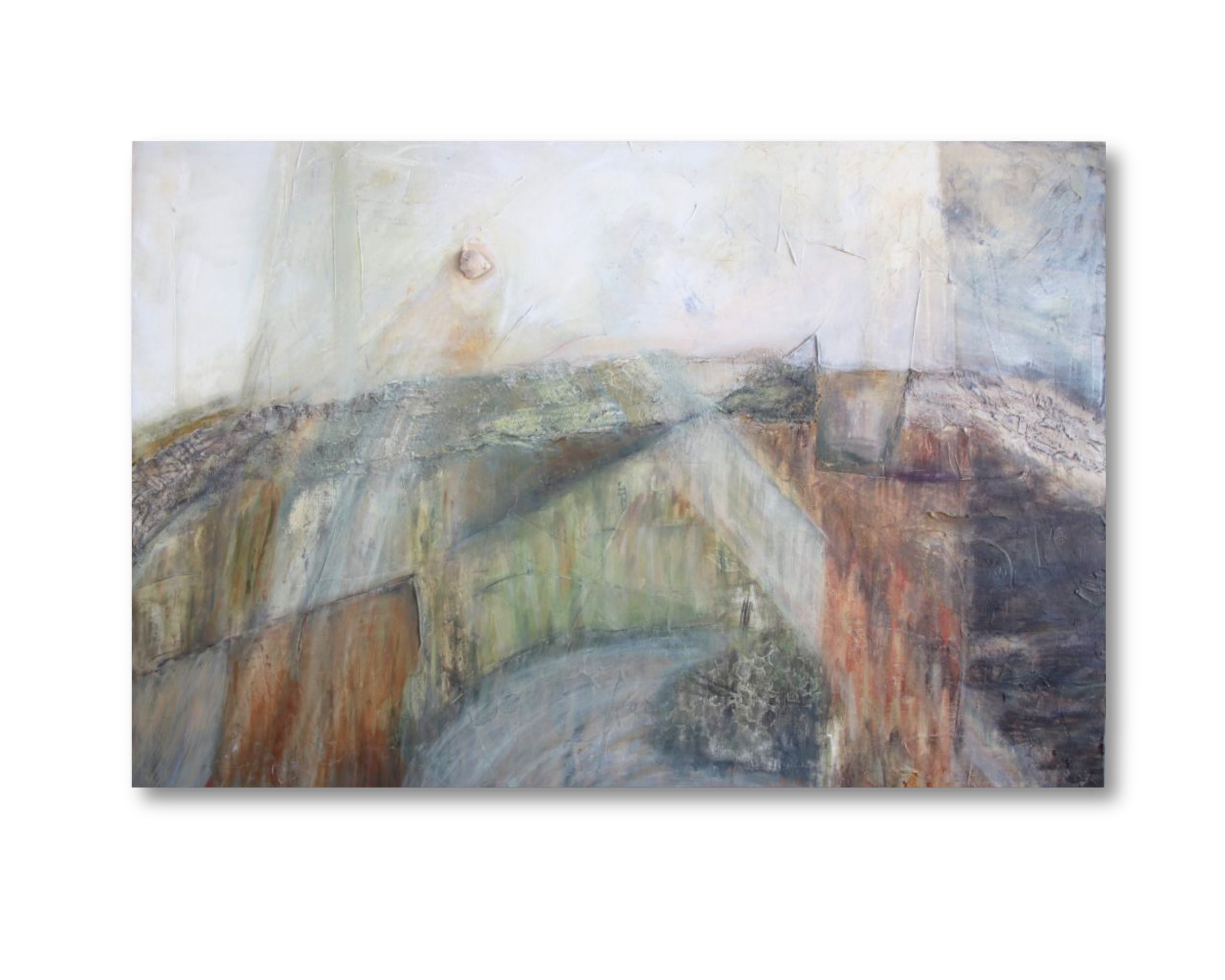 Dichte Schichten legen sich übereinander wie Wald im Nebel. Erdige Töne tragen Tiefe, nichts ist sofort eindeutig. Dann zieht sich ein helles Band aus Albsand durch die Fläche, breit, ruhig und selbstverständlich. Es liegt nicht über der Landschaft, sondern wächst aus ihr heraus. Diese Linie schafft Orientierung. Sie trennt nicht hart, sie markiert. Zwischen Verdichtung und Weite entsteht Klarheit durch eine gesetzte Bahn. “Albband” steht für eine ruhige Führung, nicht durch Lautstärke, sondern durch eine klare Linie im Raum.