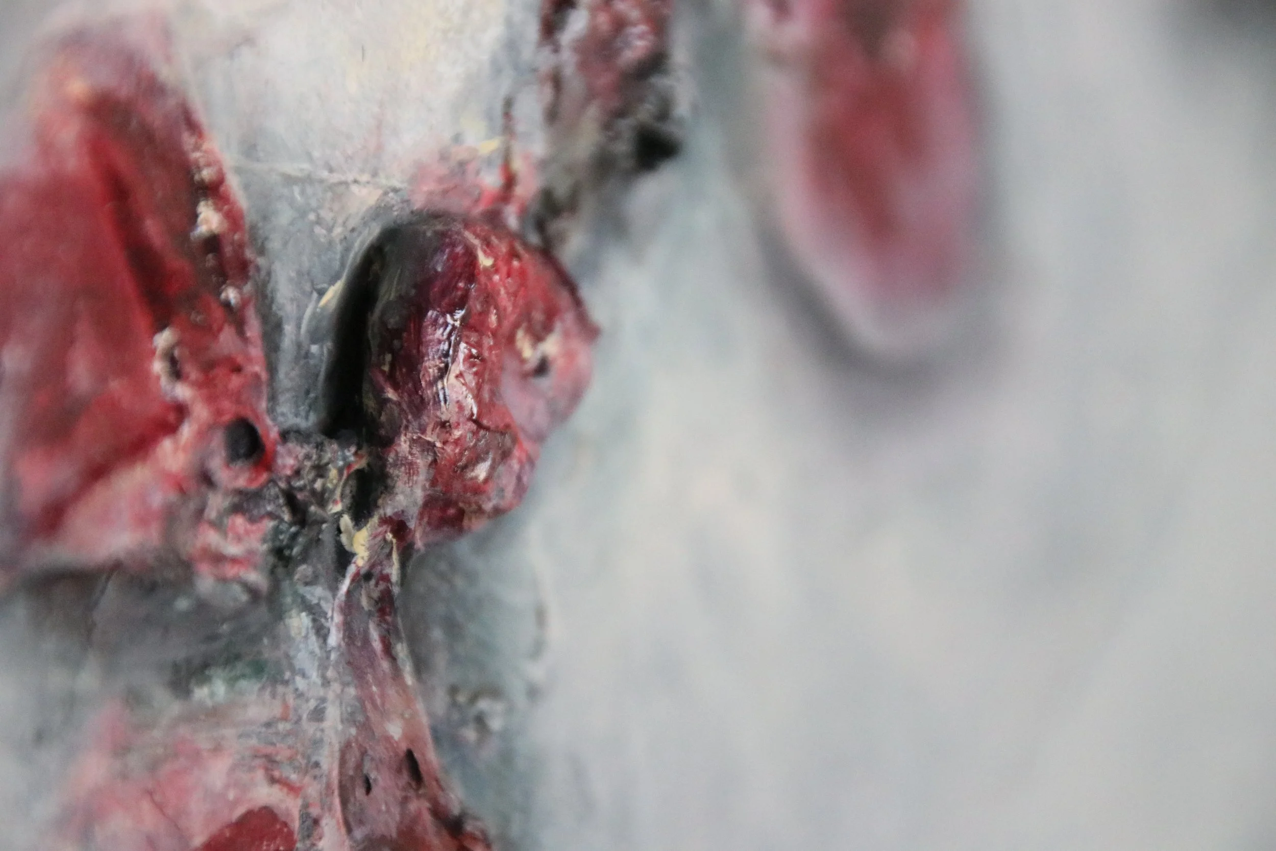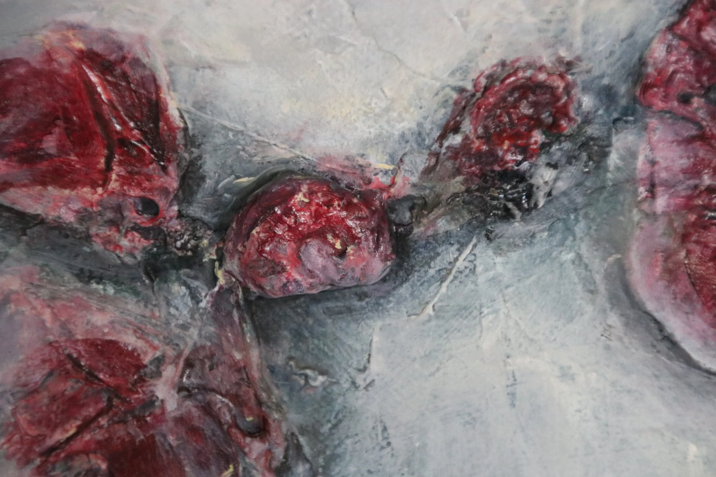An einem nebeligen, kalten Novembertag spürte ich einen scharfen Schmerz, als mich die Dornen eines Brombeerstrauchs festhielten. Voller Erstaunen sah ich eine Reihe reifer Brombeeren im Gebüsch und darunter, im feuchten Boden, ein fast übersehenes Schneckenfossil. Dieser Moment hat mich gestoppt und mir gezeigt, dass Klarheit entsteht, wenn wir bewusst anhalten. Aus dieser Szene ist der Kreuzpunkt entstanden, mit dem angedeuteten Kreuz aus Strukturen in den Farben dieser Beeren und dem Fossil im Zentrum.