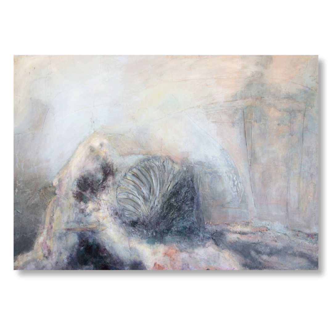 Räume, Material und Zeit treffen in Kreuzpunkt zusammen, eine fossile Schnecke bildet die ruhende Mitte im bewegten Nebel.