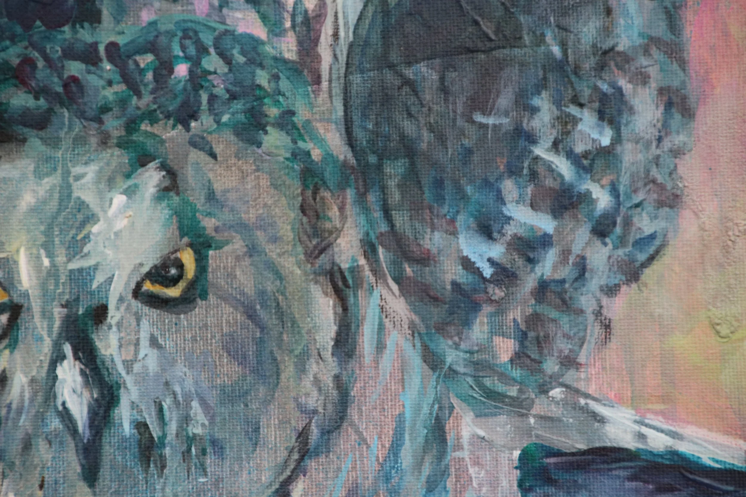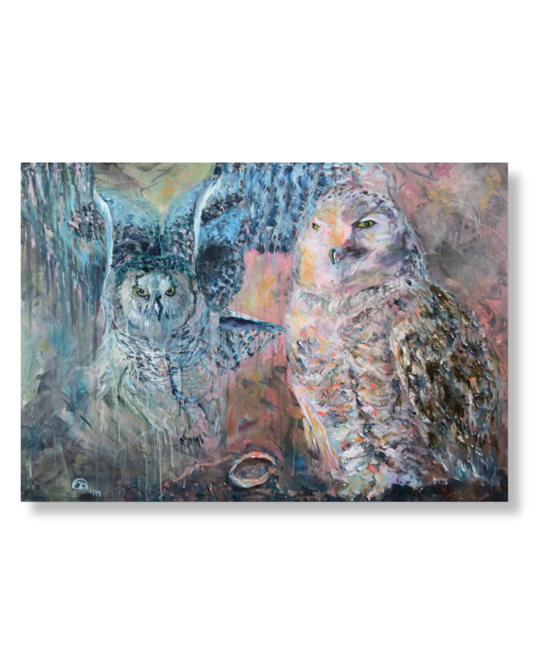 Die Tiere in meinen Gemälden verkörpern dieses Spannungsfeld. Eine Eule, die ruht, eine andere, die fliegt. Beide folgen ihrer eigenen Wahrheit. Pelikane, die geduldig in der Strömung verharren, weil sie wissen, dass der richtige Moment von selbst kommt.