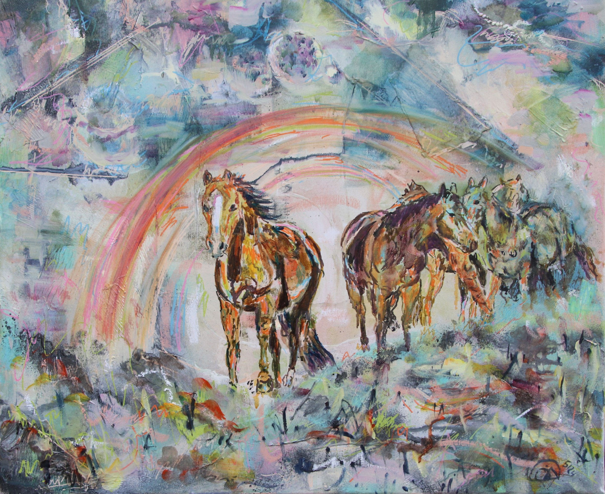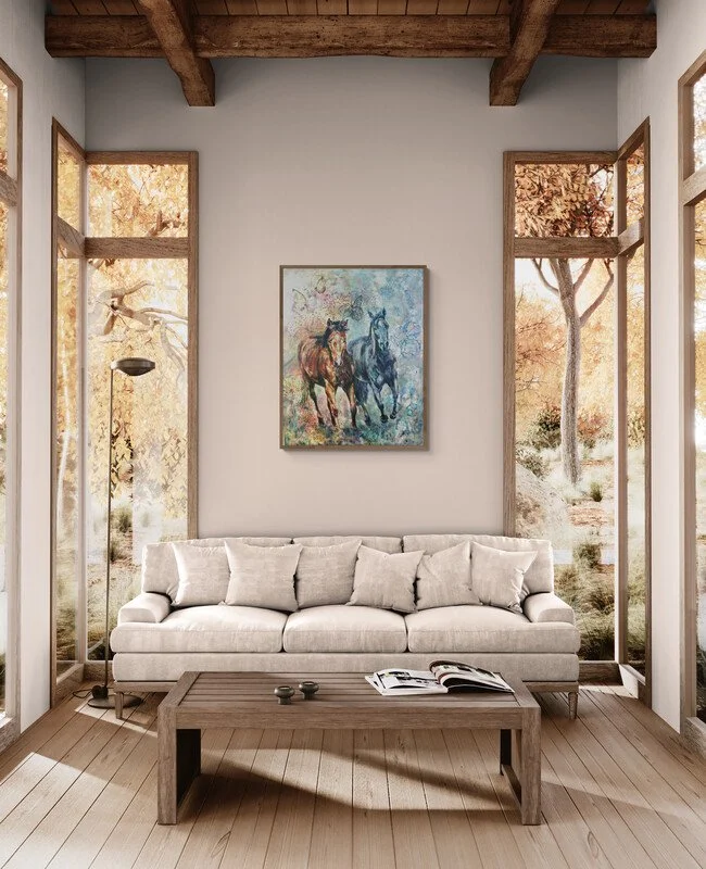 In diesem Werk zeige ich Joe Brown, das berühmte Filmpferd von Terence Hill, vor einem künstlichen, abstrakten Hintergrund aus leuchtendem Regenbogen, abstraktem Himmel und stilisiertem Gras. Hier verschmelzen Film und Realität: Der freie Galopp in der Herde symbolisiert die ungefilterte Kraft der Natur, während der inszenierte Moment im Bild eine fast starre Darstellung von Freiheit einfängt. Das Bild wirft die Frage auf, ob Freiheit im spontanen Erleben oder in der bewussten Gestaltung des Augenblicks liegt