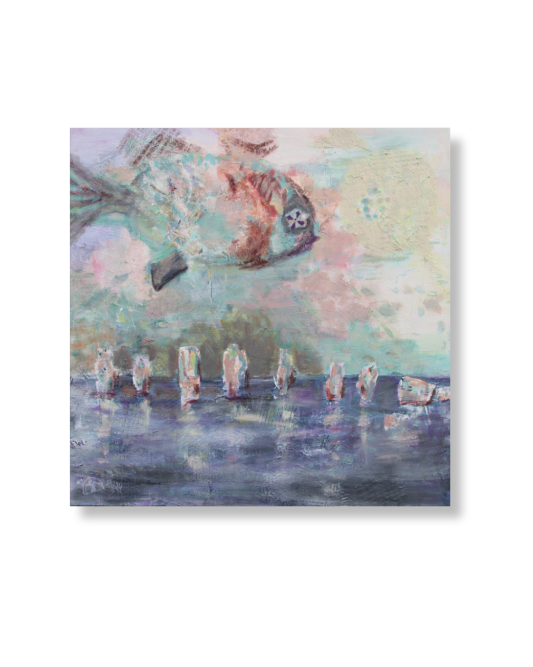 Jeder Aufbruch beginnt mit dem Mut, den ersten Schritt auf die Boje zu setzen, begleitet vom Fisch, der ruhig über allem schwebt und als Zeichen von Glück den Weg behütet.