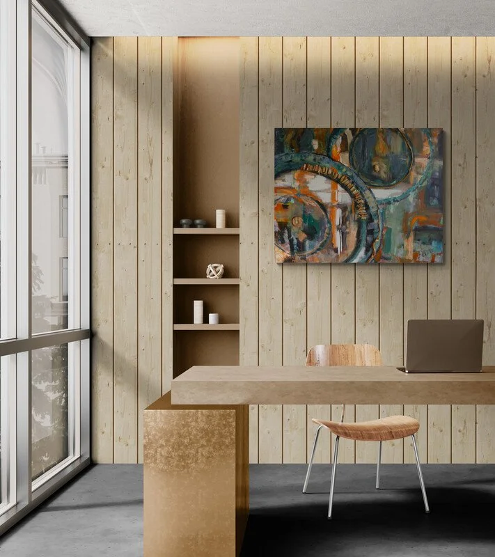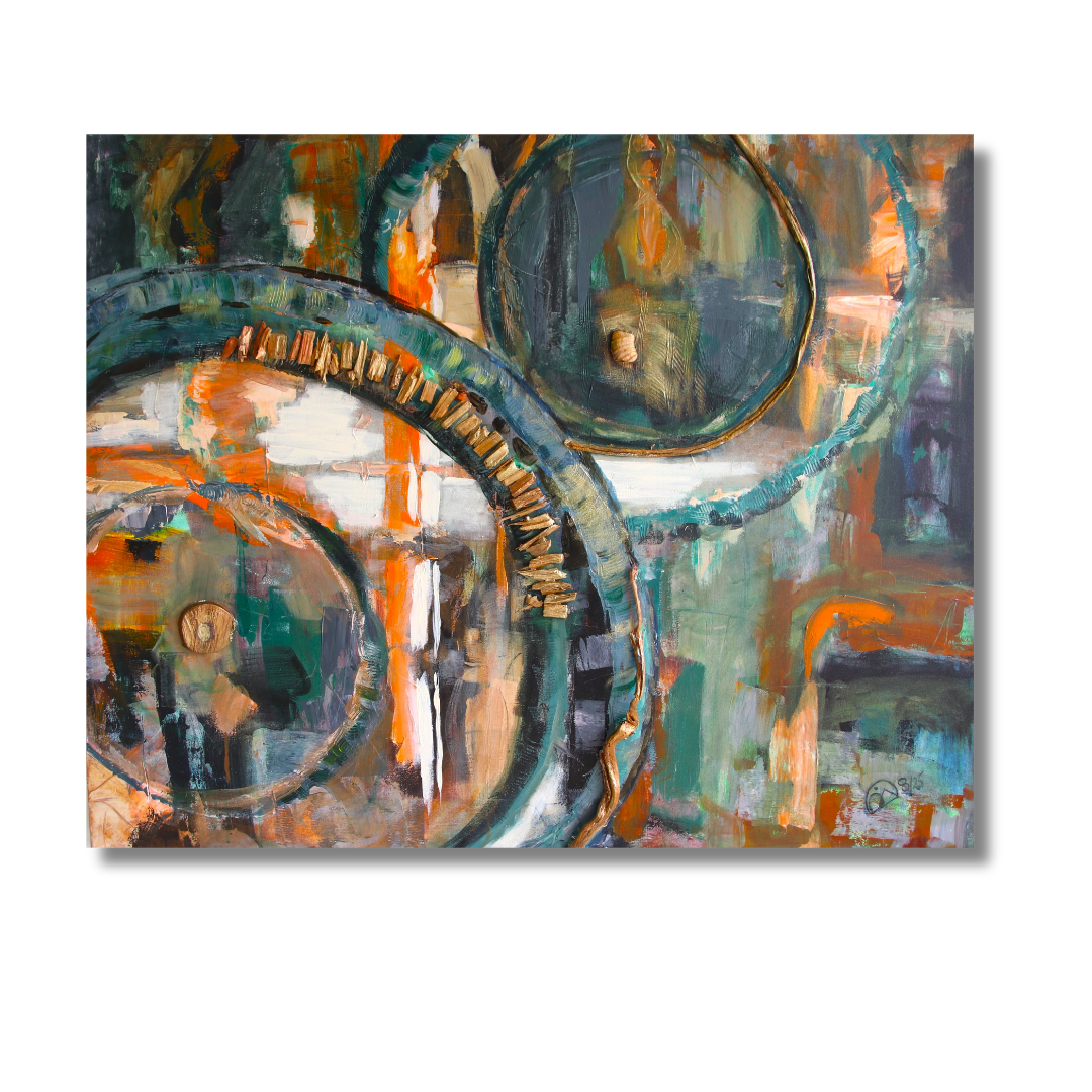 Dieses Gemälde vereint Vergangenheit und Zukunft in einem einzigen, intensiven Moment. Zwei überlappende Kreise wie Augen zeigen auf der einen Seite die Weisheit aus gelebter Erfahrung (Symbol: das versteinerte Fossil) und auf der anderen den mutigen Blick und den Aufbruch in eine neue Richtung ( Symbol: vergoldete Lindenholzstücke ). Die harmonische Farbpalette aus Orange, Türkis und Naturtönen schafft eine Brücke zwischen Klarheit, Wachstum und Aufbruch.